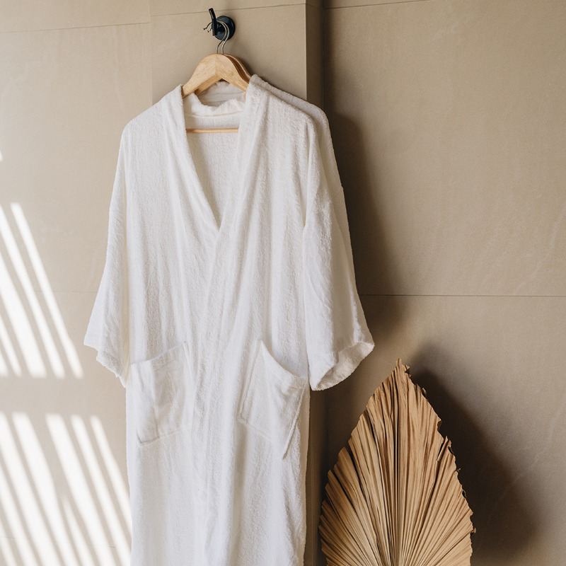 Indulge in luxury with our terry cloth bathrobe, crafted for ultimate comfort and absorbency. Made from premium terry fabric, our bathrobe wraps you in softness after every shower or bath. Enjoy its plush feel and excellent moisture-wicking properties, perfect for relaxing at home or adding a spa-like touch to your daily routine. Explore Indolinen collection and treat yourself to the perfect blend of coziness and elegance.